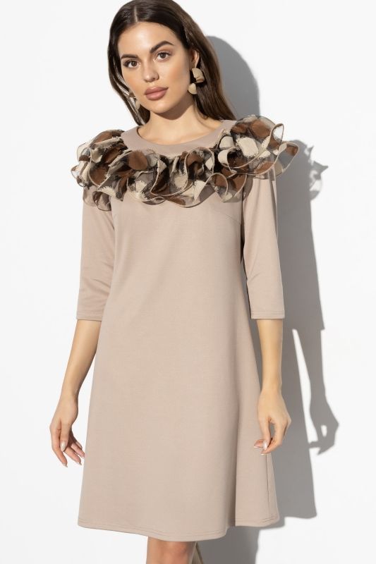 Бежевое трикотажное платье с отделкой из сетки