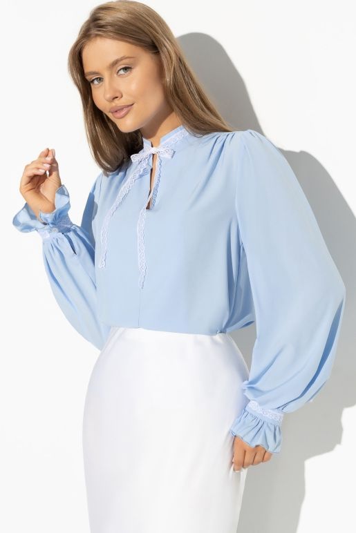Блузка голубая с завязками от бренда Charutti. Модель свободного силуэта, выполнена из ткани "софт". Пышные длинные рукава оканчиваются воланом. Оригинальная блузка для создания женственного образа.