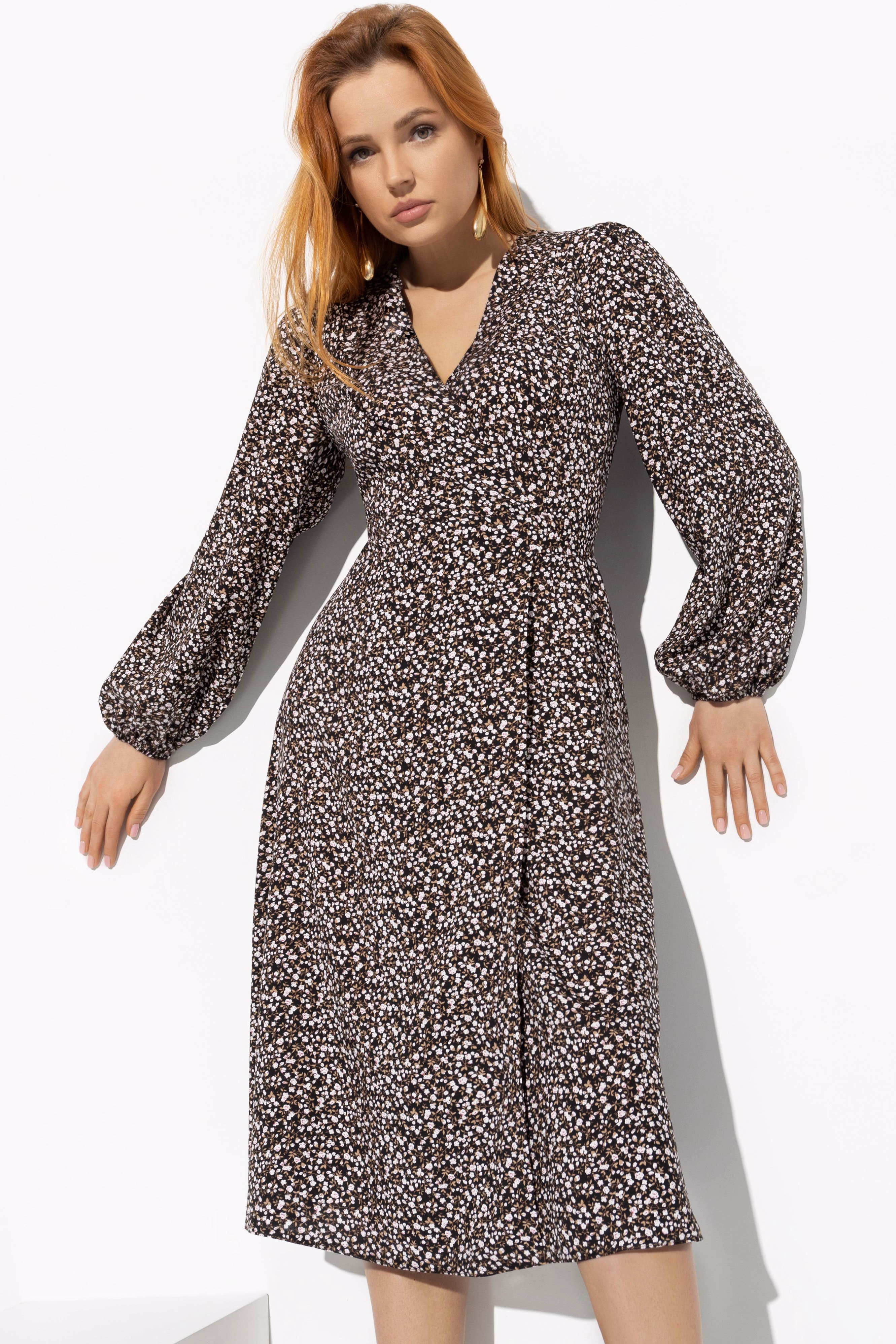 Коричневое платье на запах с принтом от компании Charutti. Модель полуприлегающего силуэта, выполнена из штапельного полотна. Горловина V-образная. Втачной длинный рукав собран на резину. Отрезное по линии талии. Изделие прекрасно подойдёт для любого случая.