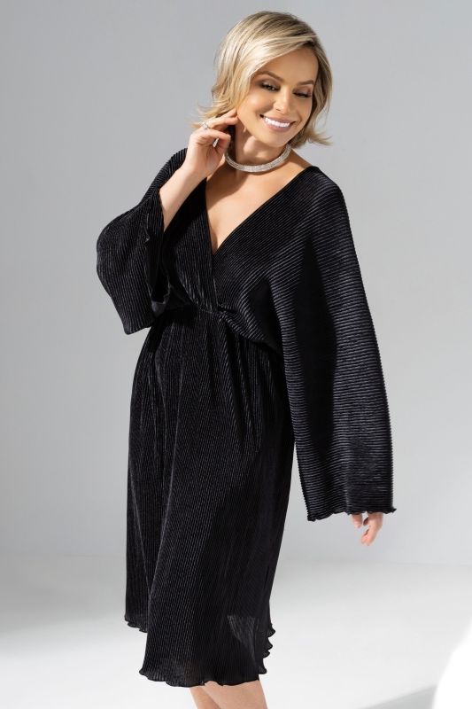 Платье чёрное из трикотажа-гофреот компании Charutti. Модель полуприлегающего силуэта. Тонкая скрытая резинка на талии. Рукав длинный, широкий. V-образный вырез зоны декольте и на спине подойдет на любой объем груди. Есть широкие ленты по спинке изделия. Материал изделия фактурный. Платье хорошо смотрится на любом типе фигуры.