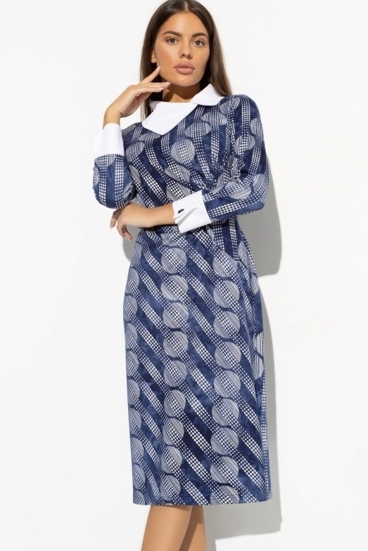 Платье-футляр синее с принтом от компании Charutti. Модель полуприлегающего силуэта, выполнена из трикотажного полотна "оттоман". Вырез горловины круглый, с отложным воротником. Втачные длинные рукава на манжетах. По линии талии сбоку идет сборочка. По спинке разрез. Самое то для Вашего классического гардероба.