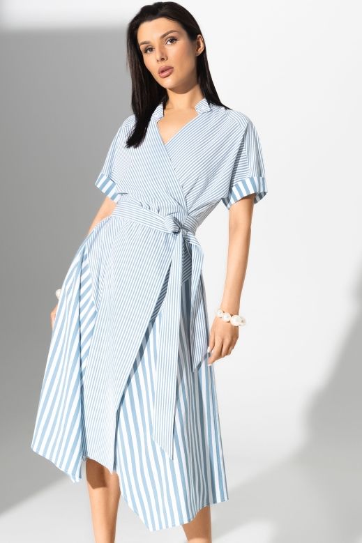 Платье голубое на запах в полоску от компании Charutti. Модель полуприлегающего силуэта, выполнена из рубашечной ткани "поливискоза". V-образный вырез горловины. Короткие цельнокроеные рукава с отворотами. В боковых швах карманы. Идеальный выбор для Вашего летнего гардероба.