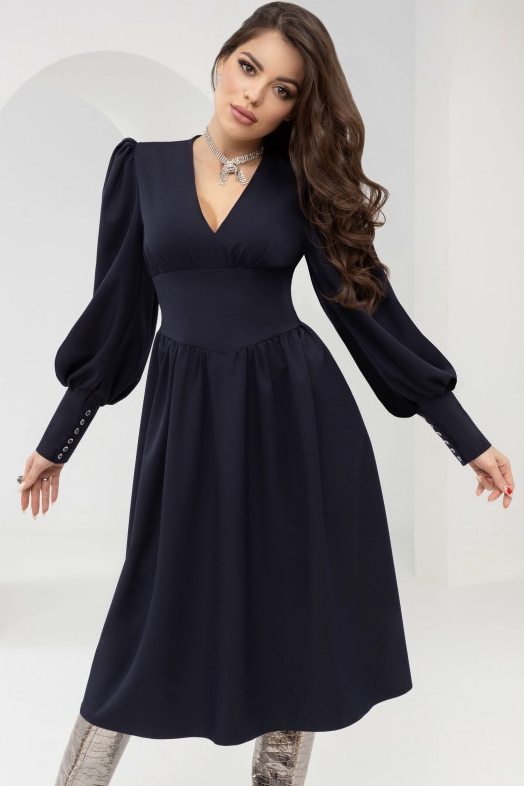 Привлекательное женское платье от компании Charutti. Модель свободного силуэта, выполнена из костюмной ткани "туар" в синем цвете. V-образный вырез горловины. Объёмные, втачные, длинные рукава на манжетах с защипами. Отрезное по линии талии и под грудь. По спинке застёжка на потайную молнию. Идеальный выбор для Вашего женственного гардероба.