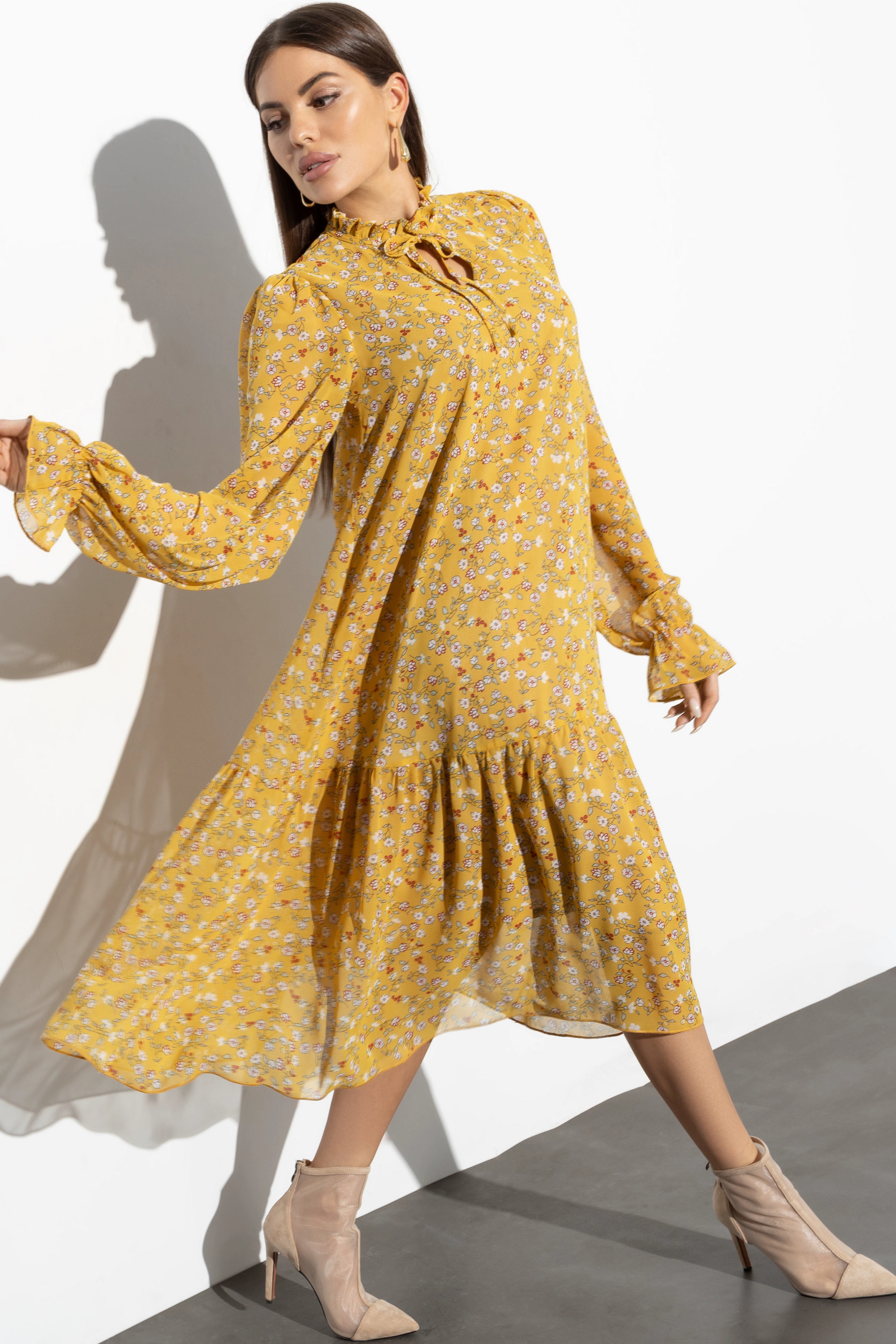 Шифоновое платье с завязками по горловине от компании Charutti. Модель свободного силуэта, пошита на трикотажном подкладе. Воротник-стойка, оформлен рюшей, с вырезом "капля" и завязками. Втачные длинные рукава на резинке. По низу притачной волан. Идеальный выбор на каждый день.