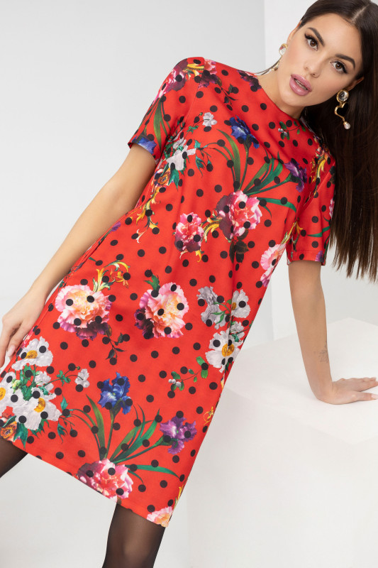 Яркое женское платье от компании Charutti. Модель свободного силуэта, выполнена из вискозного полотна "хэви принт" в красном цвете. Круглый вырез горловины. Втачные короткие рукава. Идеальный выбор для создания яркого образа.