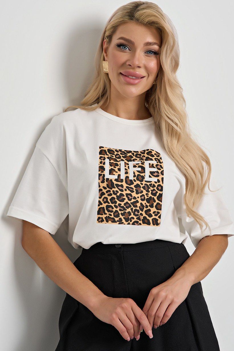 Футболка трикотажная молочного цвета с печатным принтом от компании Jetty. Модель свободного силуэта, с округлым вырезом горловины. С короткими втачными рукавами. Линия плеча спущена. Прекрасный вариант для любого мероприятия.