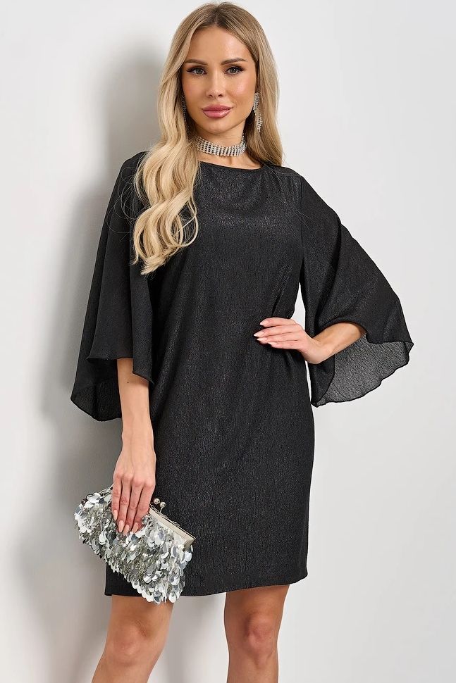 Платье из жатого шифона чёрного цвета от компании Jetty. Модель прямого силуэта, с подкладом в насышенном винном оттенке. Втачные расклешенные рукава. Это элегантное платье создаст утонченный и роскошный образ для любого мероприятия.