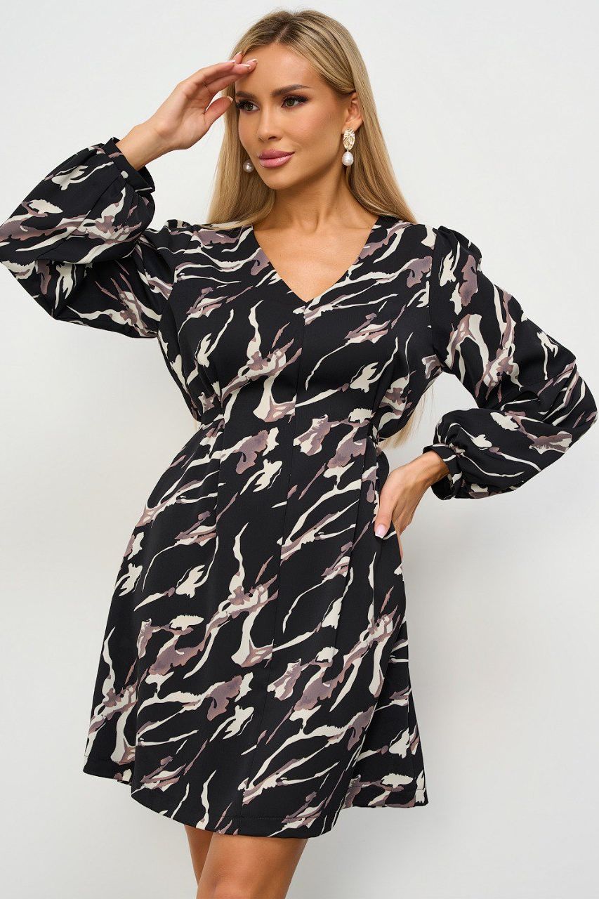 Платье короткое чёрное с принтом от производителя Jetty. Модель полуприлегающего силуэта, выполнена из плательной ткани. V-образный вырез горловины. Втачные длинные рукава на манжете. Без застёжки. Платье дополнено завязками, которые можно завязать как по переду, так и по спинке. Идеальный выбор на каждый день.