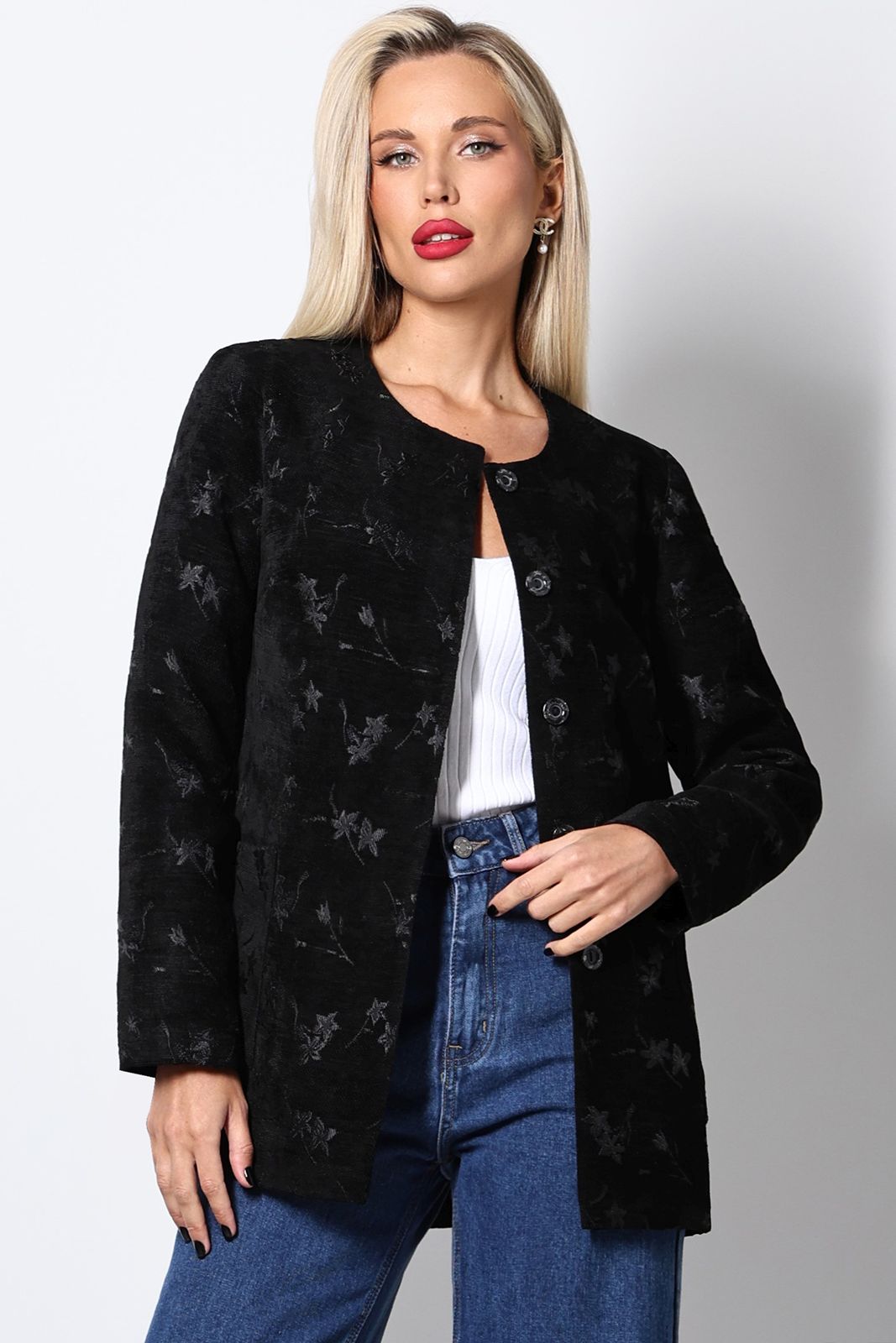 Жакет из костюмного плотного вельвета с цветочным принтом в чёрном цвете от компании SelenaSonata. Жакет с удобными и функциональными карманами. Модель прямого кроя, круглый вырез горловины. Втачные длинные рукава. Центральная застежка на петли и пуговицы. Подойдёт для комплекта с юбкой, брюками, джинсами. Без подклада. Идеальное решение для создания стильного образа. Обращаем внимание - ткань НЕ тянется.
