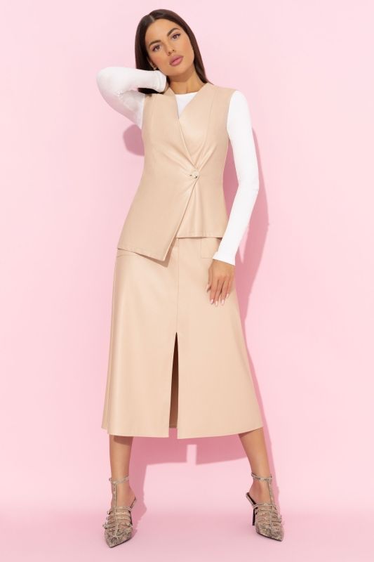 Юбка бежевая из экокожи с разрезом от компании Charutti. Модель приталенного силуэта в длине миди. Посадка высокая, на талии. Изделие застегивается на молнию и пуговицу. Есть карманы.Идеальный выбор для создания женственного образа.