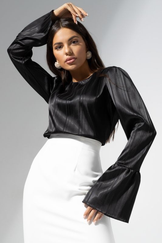 Блузка чёрная с расклёшенными рукавами от бренда Charutti. Модель прямого силуэта, выполнена из ткани "жаккард". Круглый вырез горловины. По спинке акцентная застёжка на молнию. Хорошо смотрится в заправленном виде и навыпуск. Стильный вариант для создания модного образа.