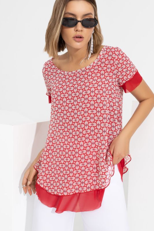 Восхитительная женская блузка от компании Charutti. Модель свободного силуэта, выполнена из шифонового полотна, с отделкой из сетки-стрейч в красном оттенке. Круглый вырез горловины с завязками по спинке. Короткие втачные рукава. Низ фигурный. Прекрасный выбор для создания яркого повседневного образа.