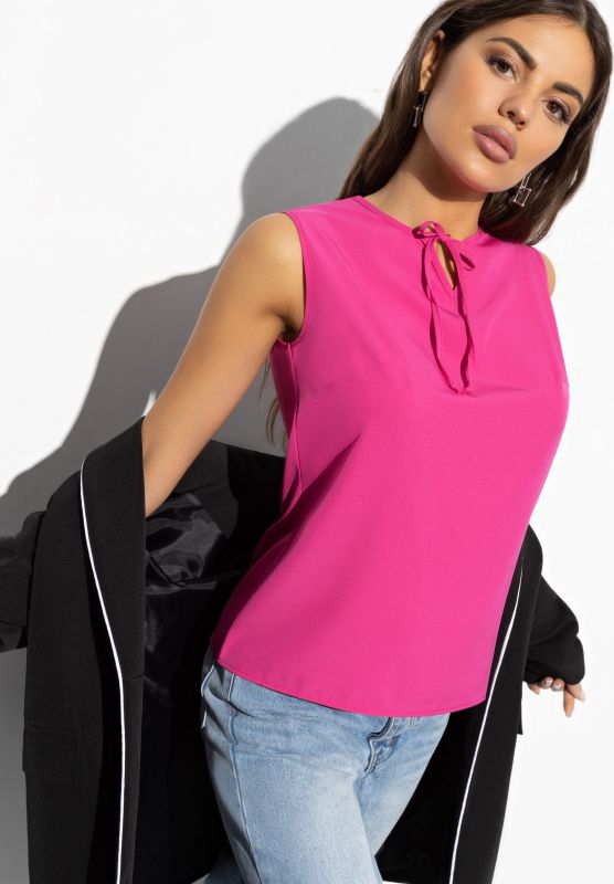 Женская блузка в цвете фуксия от компании Charutti. Модель прямого силуэта, выполнена из плательной ткани "ниагара". Круглый вырез горловины с разрезом и завязками. Без рукавов. Низ ровный, без разрезов. Отличный выбор для создания эффектного образа.