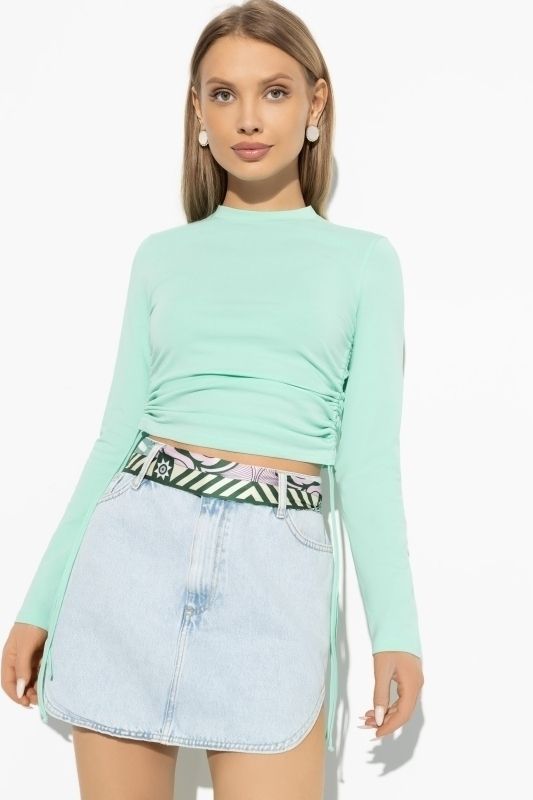 Укороченный лонгслив мятного цвета с кулисками и завязками по бокам от компании Charutti. Модель полуприлегающего силуэта, выполнена из трикотажа «кулирная гладь». Круглый вырез горловины. Втачные длинные рукава. Идеальный выбор на каждый день.