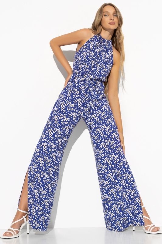 Комбинезон синий в мелкий цветочек с поясом от компании Charutti. Модель полуприлегающего силуэта, выполнена из штапельного полотна. Верхняя часть без рукавов, завязки на спинке. Брюки свободного кроя, с разрезами до колена. Идеальный выбор для Вашего стильного гардероба.