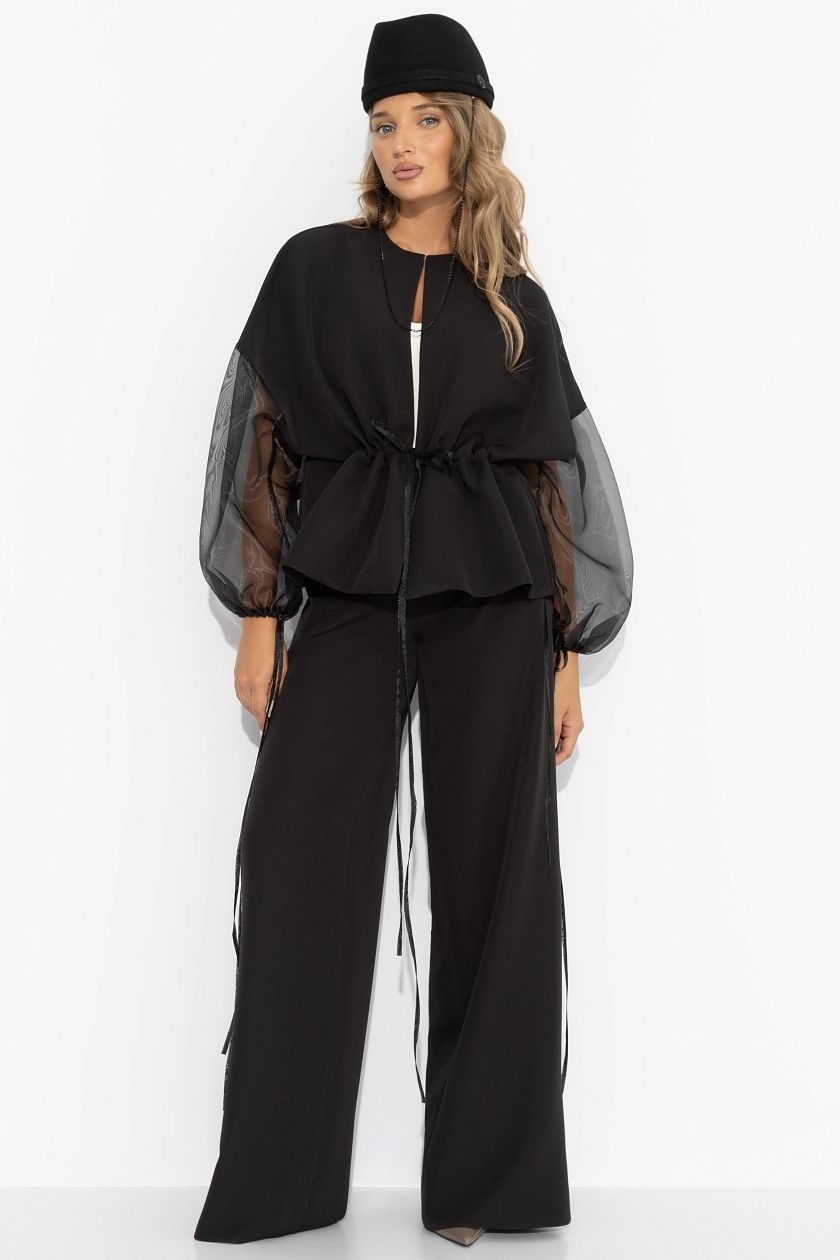 Костюм-двойка чёрный с брюками от компании Charutti, выполнен из костюмной ткани. Комплект состоит из широких брюк и жакета свободного кроя. Брюки с высокой посадкой, с карманами. Пояс брюк на широкой скрытой резинке. Рукава жакета из органзы в тон основного материала. Рукава также оформлены тонкими завязками. Жакет с тонкими завязками в виде кулиски. Отличный выбор для Вашего безупречного образа.