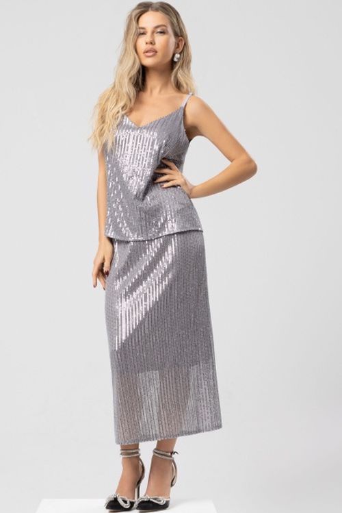 Серебристая юбка с пайетками от компании Charutti. Модель прямого силуэта. Притачной пояс на резинке. С изнанки – гладкий, мягкий подклад. Идеальный выбор для городских модниц.