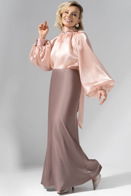 Юбка-макси шёлковая кофейного цвета от компании Charutti. Модель прямого силуэта, выполнена из ткани "бавария". Талия изделия на тонкой вшитой резинке. Подклада нет. Идеальный выбор для модного образа на торжество.